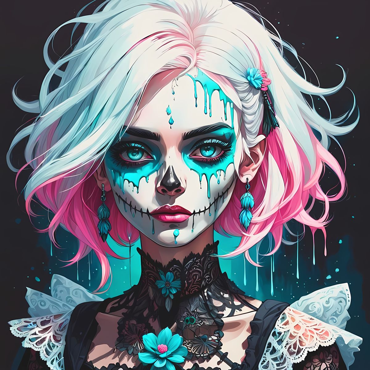 A striking portrait of a girl with white hair, set against a dark background with vibrant pink and cyan tones. Her skeletal appearance and Angura kei fashion are rendered in a detailed, neo-traditional style with dripping paint effects.
