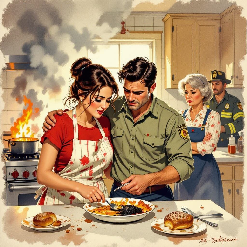 This image captures a chaotic scene of a burnt meal, a distressed wife, and a stern mother-in-law, with firefighters present. The style blends warm lighting with cartoonish exaggeration and emotive storytelling.