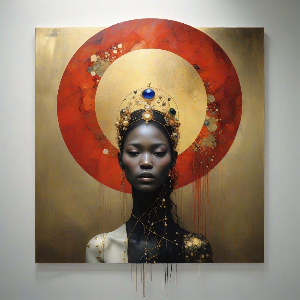 A portrait evoking art nouveau and secessionist aesthetics. The image features rich colors and intricate patterns reminiscent of early 20th-century portraiture.