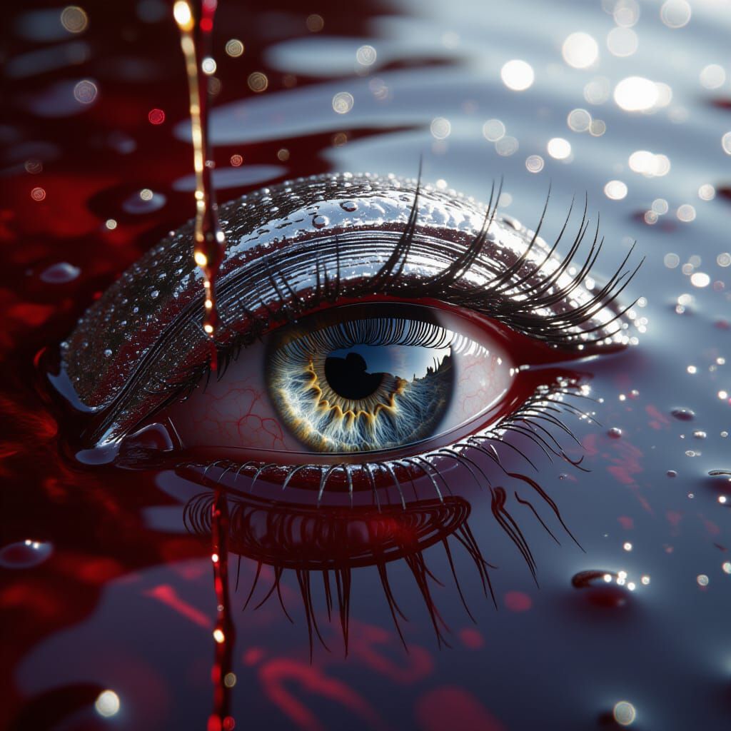 This image shows a close-up of eyes with silver irises crying honey, submerged in red water. The aesthetic evokes cinematic film with dramatic lighting and color grading.