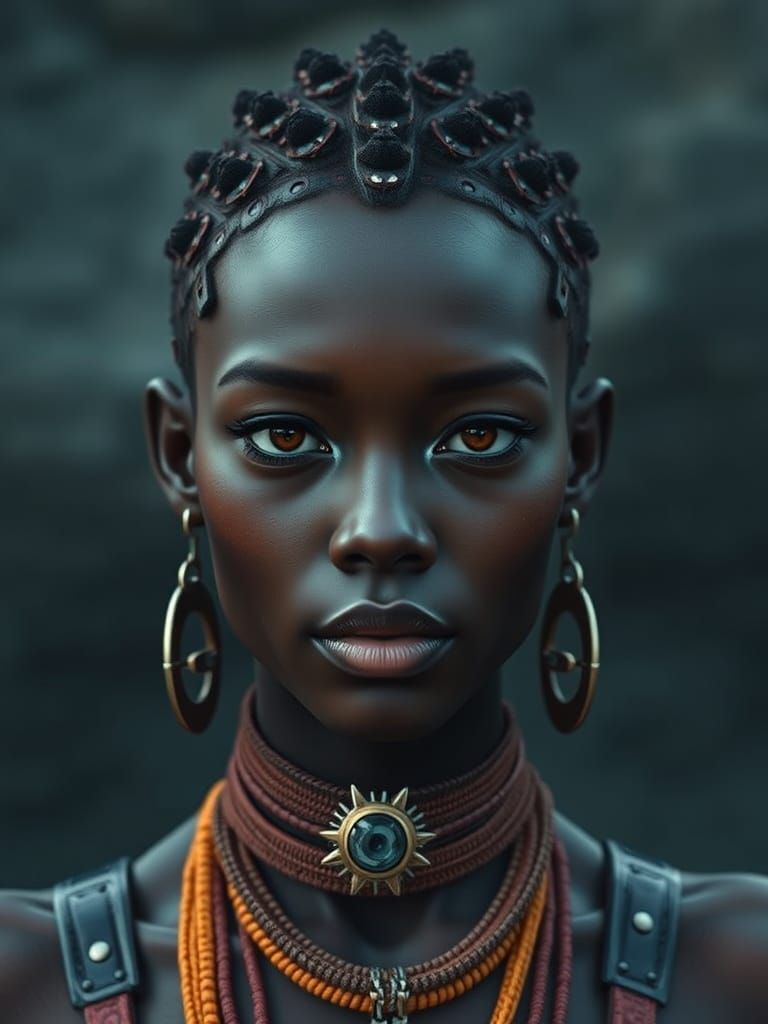 A striking image of a woman with shaved hair and dark skin, enhanced by tribal jewelry. The portrait features intense eyes and a complementary color scheme with hyperrealistic detail.