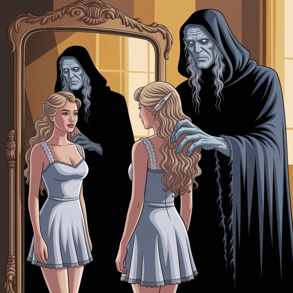 A beautiful woman stands in a golden-lit room, her long blonde curls adorned with a comb and clip, as a dark, ancient figure looms over her, casting a sinister shadow