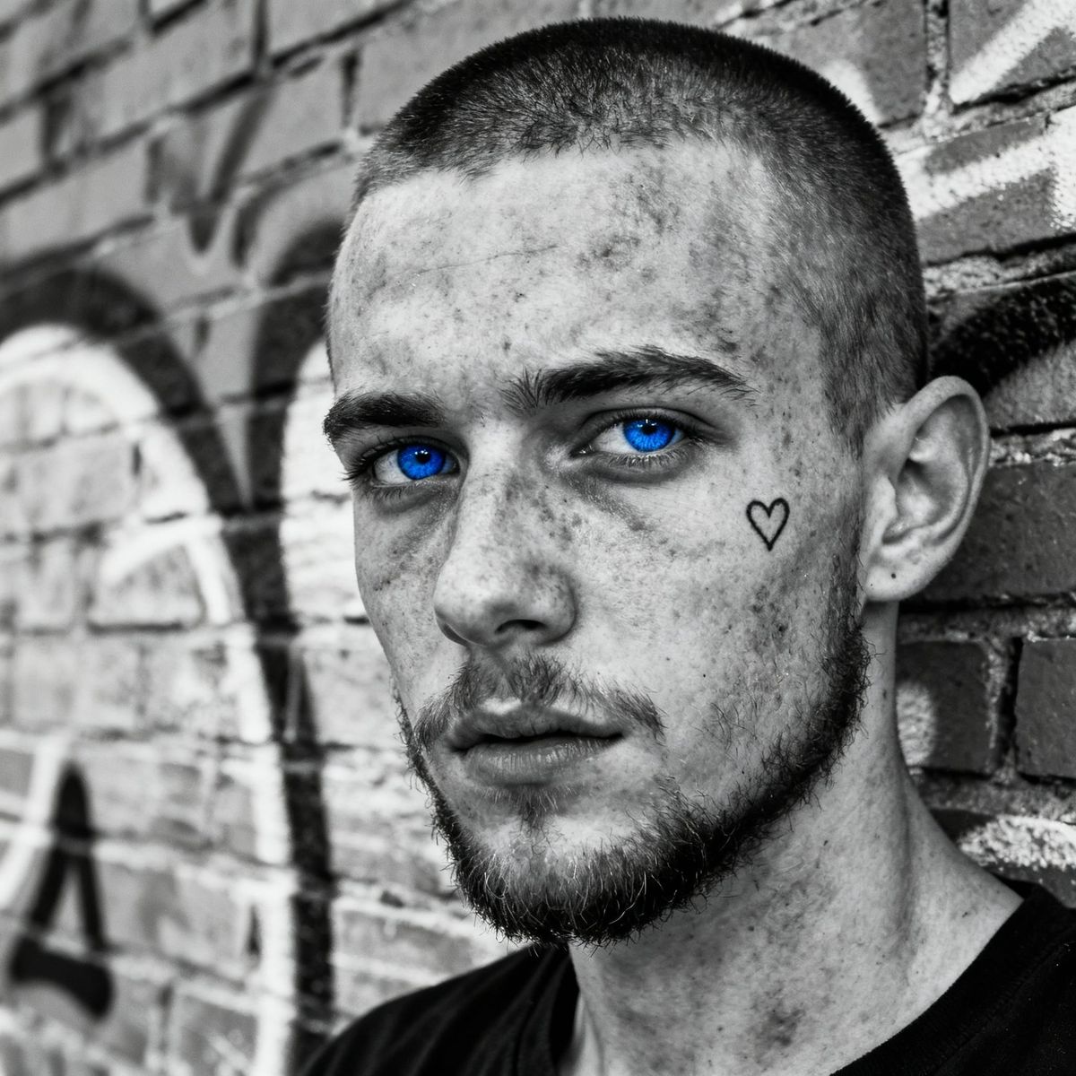 This striking close-up portrait features a young man with a trimmed beard, a small heart tattoo on his cheek, and bright blue eyes. The background is a spray-painted brick wall, captured with ambient light.