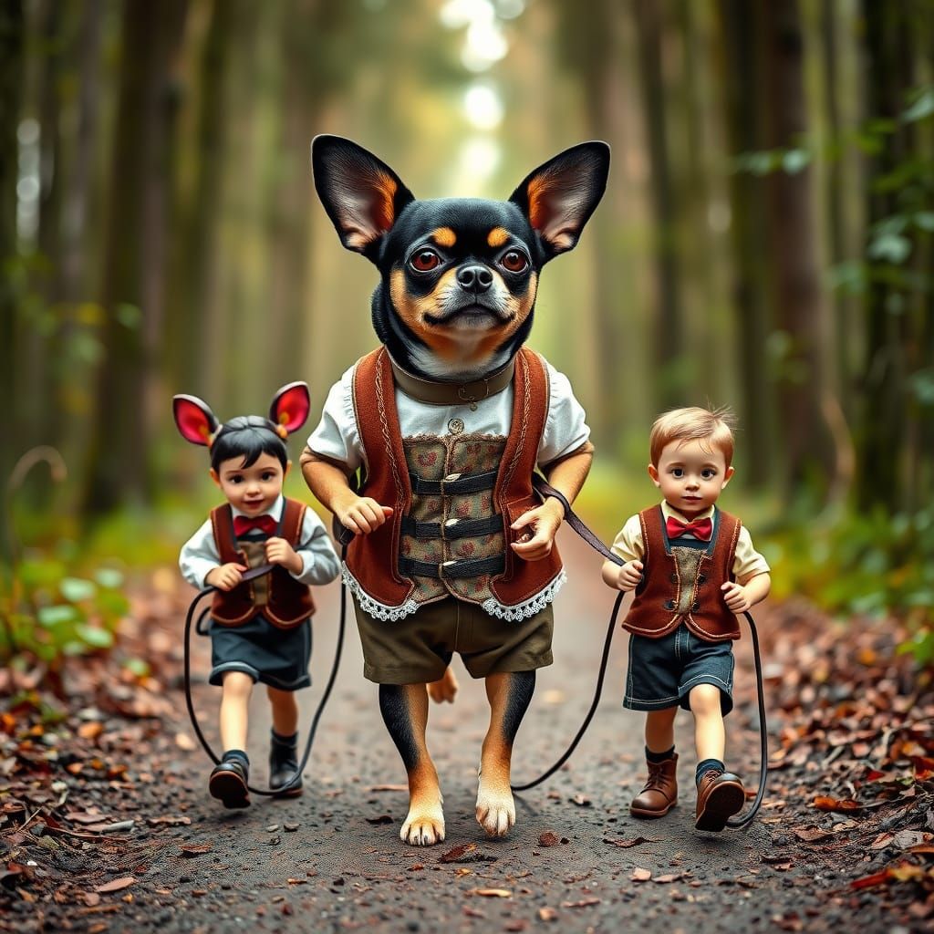 This whimsical image shows a dignified anthropomorphic chihuahua in traditional Bavarian garb leading two tiny humans in streetwear on a forest path.