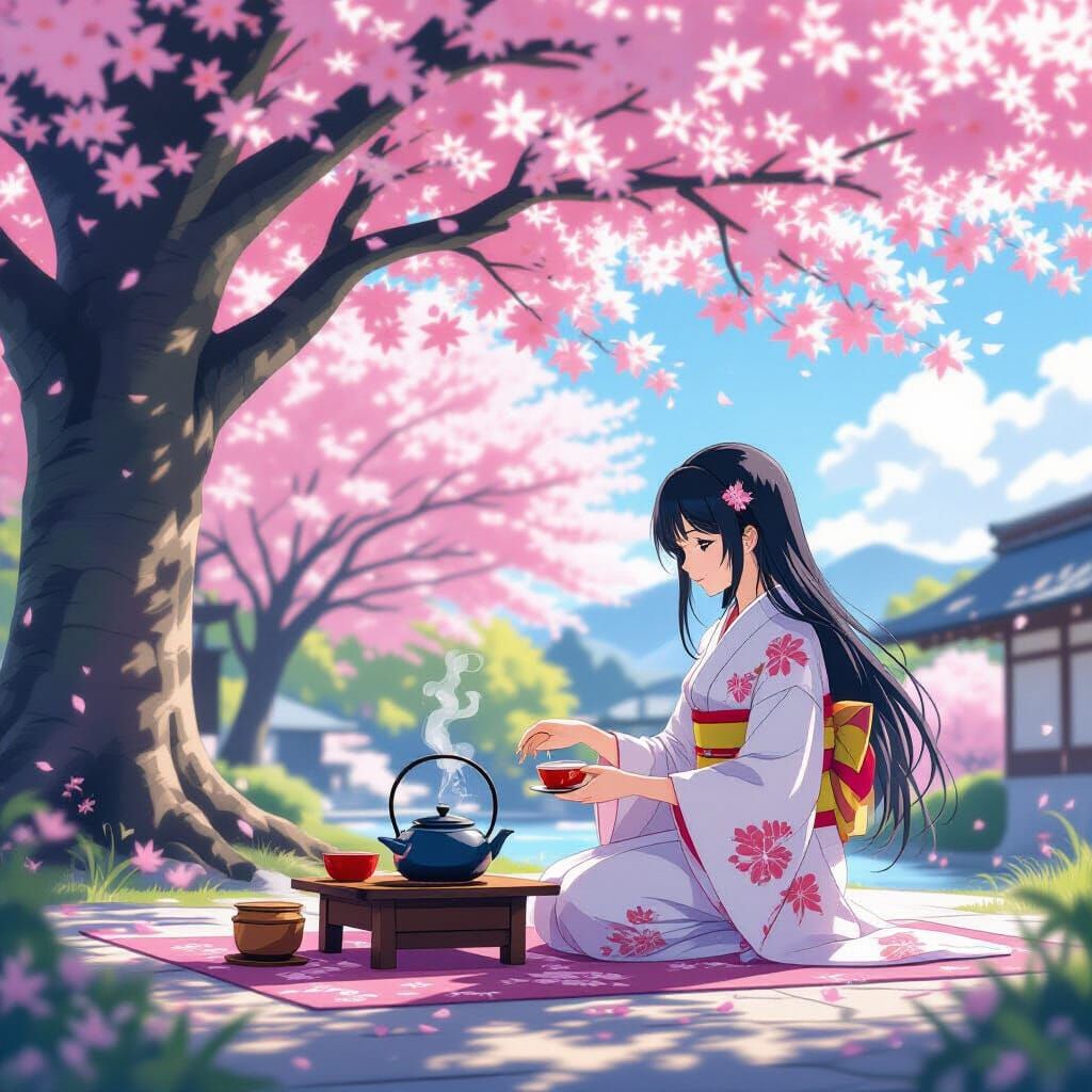 This image shows a beautiful woman with long black hair in a kimono preparing tea under a cherry blossom tree. The image is in a Japanese anime style, reminiscent of Studio Ghibli.