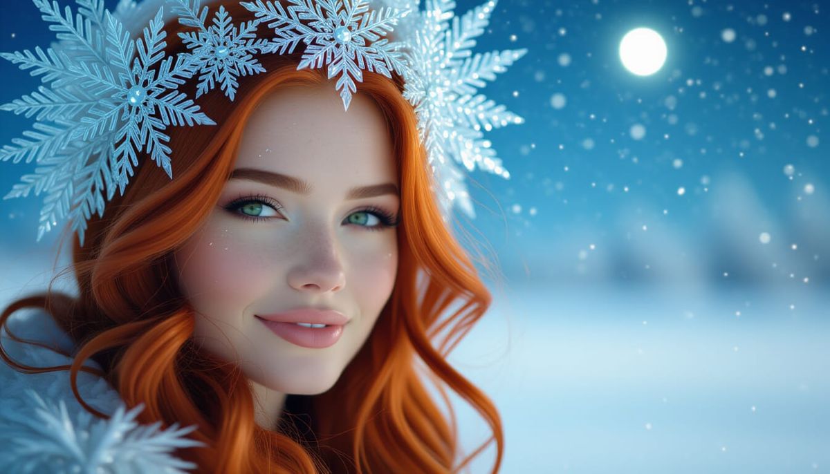 A serene portrait of a woman with red hair and green eyes, adorned with a crystalline snowflake headdress. Set against a frozen tundra and starry night, the image features luminous lighting and intricate details in a photorealistic style.