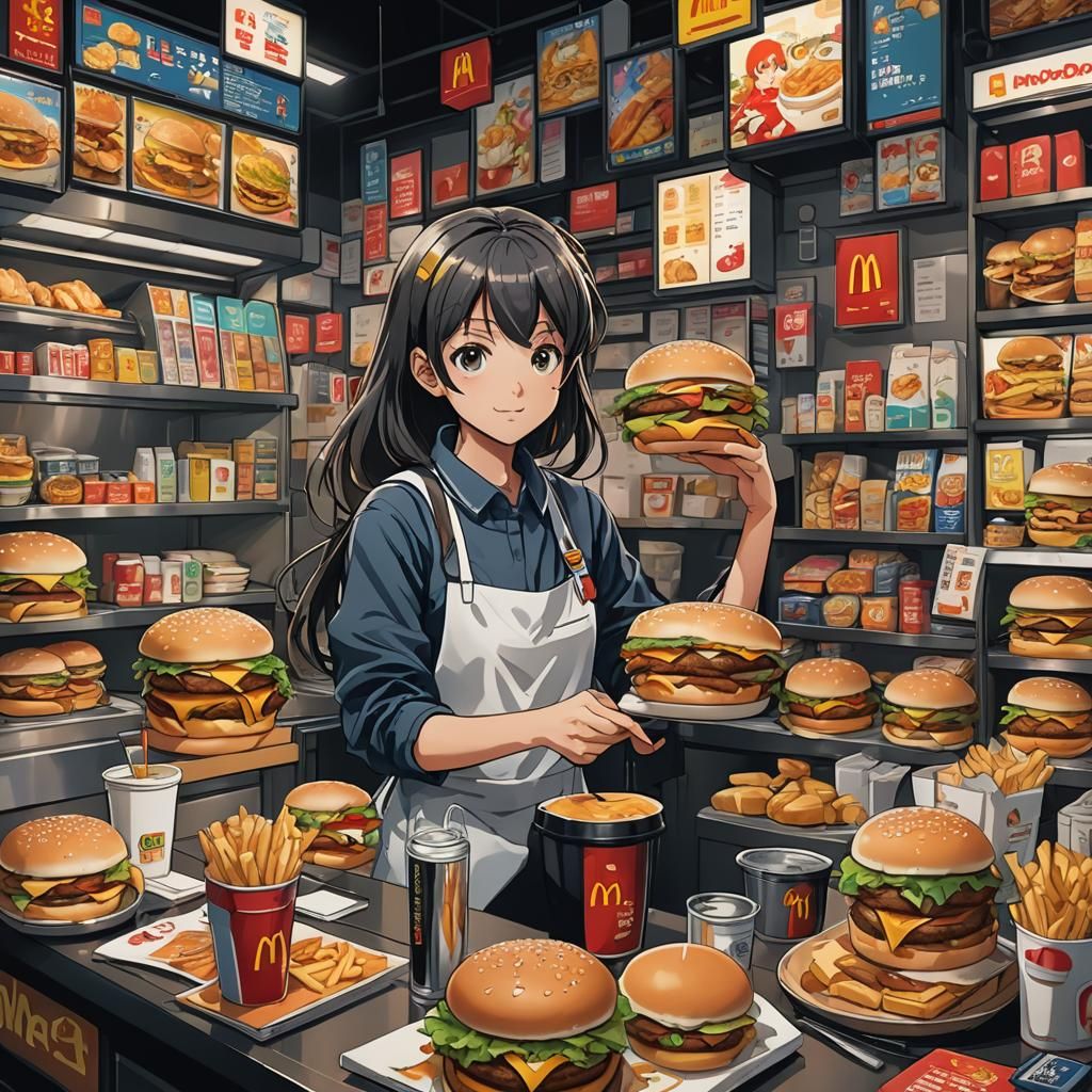 This image shows a cel-shaded, manga-style illustration of a McDonald's restaurant. The artwork, reminiscent of Studio Trigger, boasts deep colors and cinematic lighting.