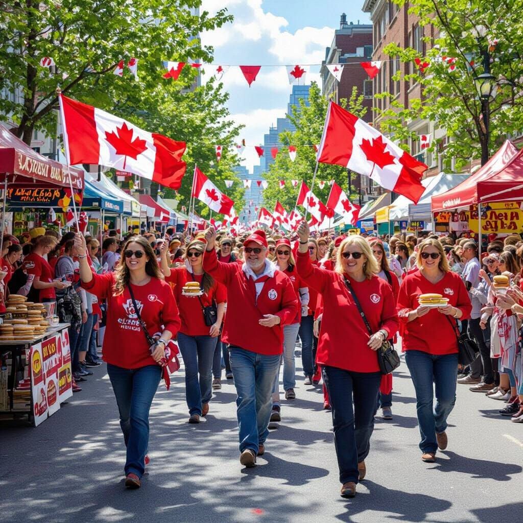 This image shows a jubilant Canada Day parade. People in red wave Canadian flags amidst games, activities, and food stalls. The scene evokes classic Canadian landscape painting styles.