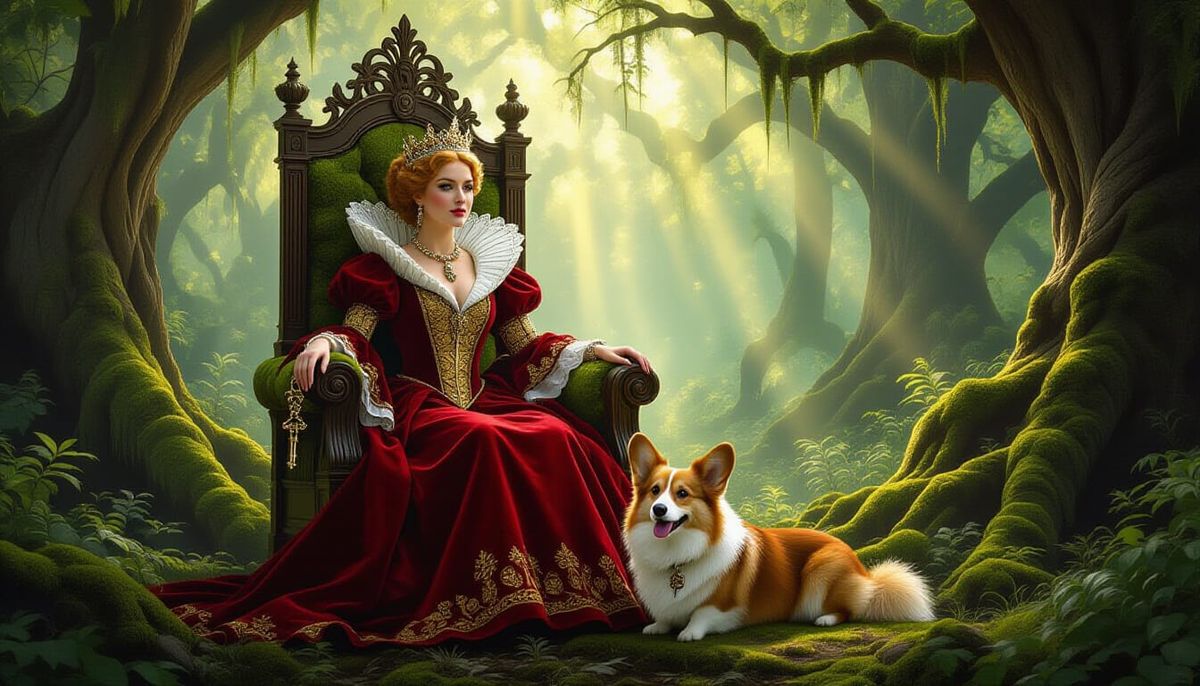 This image depicts a queen on a mossy throne in a sun-dappled forest, her corgi at her feet holding an ornate key. It captures a mood of quiet contemplation and mystery, rendered in a richly detailed, atmospheric style.