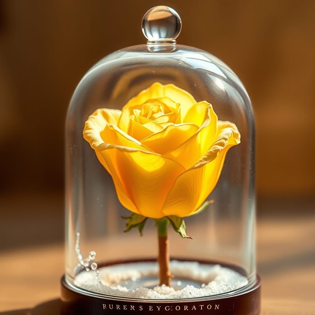 This image depicts a delicate, intricately detailed yellow rose surrounded by condensation in a crystal glass dome, evoking the dreamy atmosphere of a nostalgic conservatory with Art Nouveau flair and hyper-realistic detail.