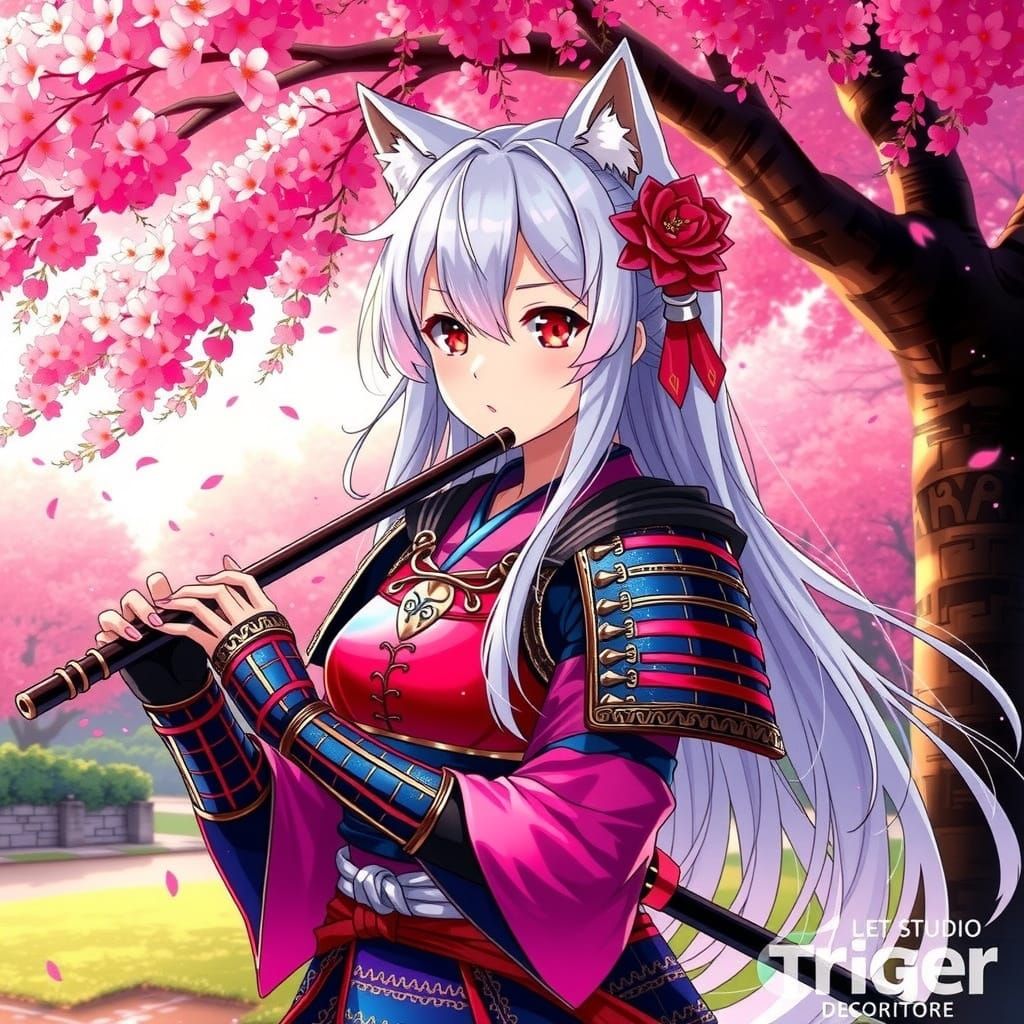 A vibrant anime girl with wolf ears plays a flute beneath cherry blossoms. Rendered with crisp lines and cel-shaded tones, the image evokes the style of manga with rich, saturated colors.