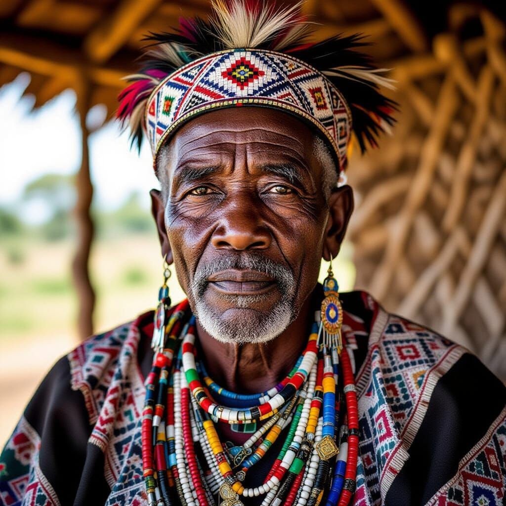 This image shows an African tribal elder in ceremonial dress and traditional jewelry. The portrait captures his dignified expression and the detailed textures of his attire against a softly lit background.