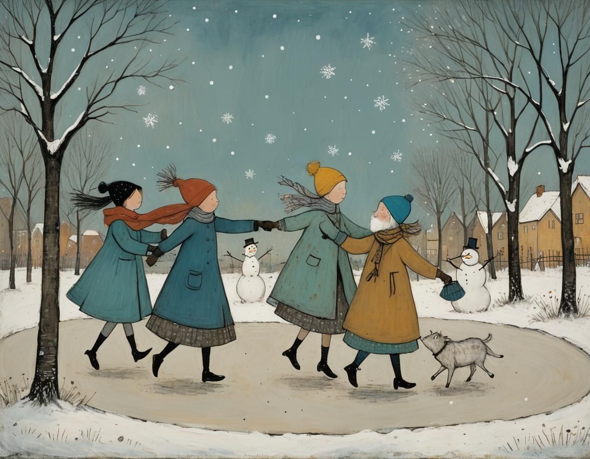 This image depicts a charming scene of snowflakes dancing. The art style evokes a sense of gentle storytelling and nostalgic illustration, perfect for winter themes.