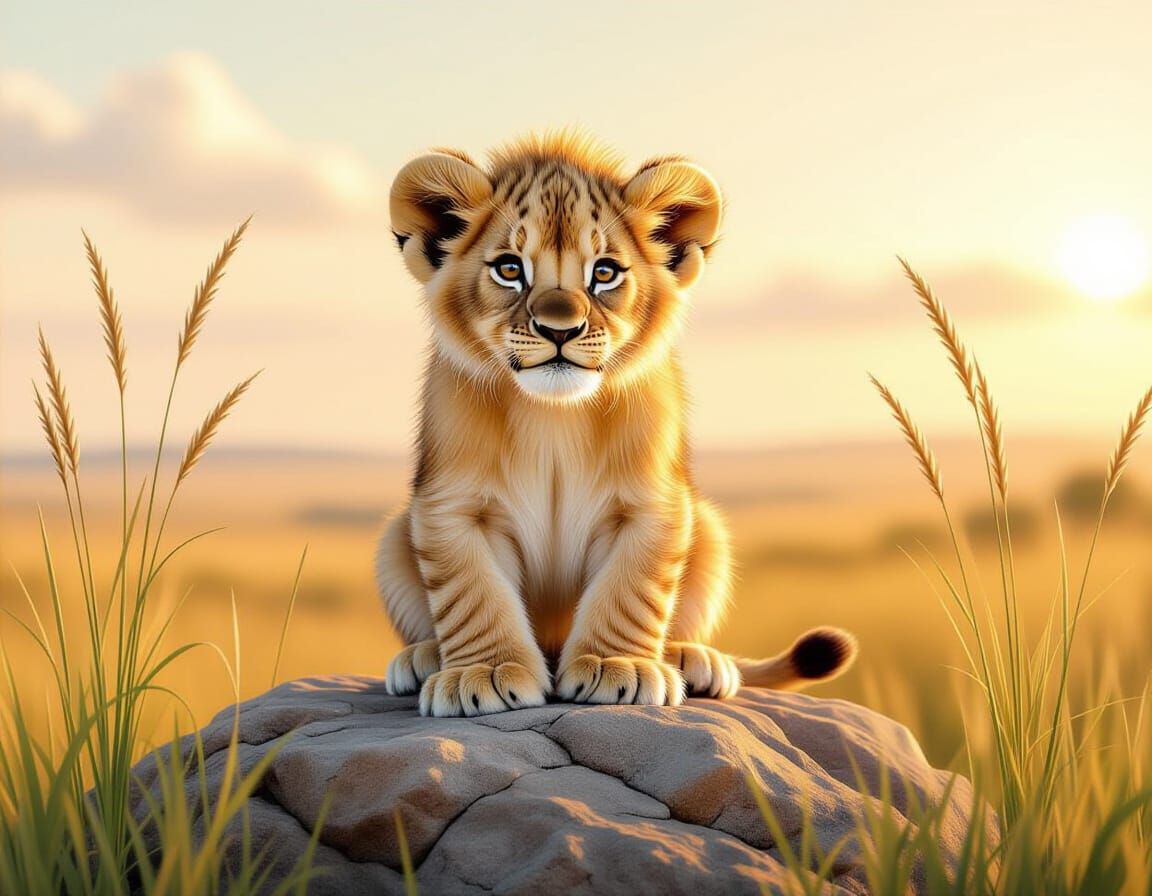 A charming watercolor painting of a fluffy lion cub on a rock. The cub is surrounded by tall grasses bathed in the light of the African sun, rendered in soft pastel colors.