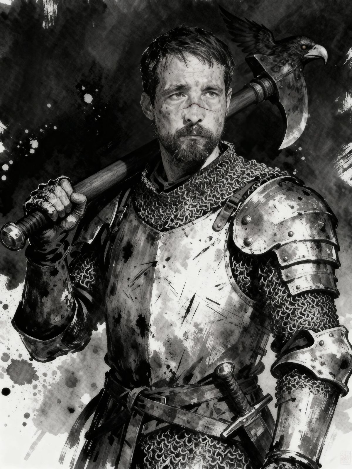 This image features a character holding a distinctive raven beak warhammer. The weapon's unique design is the central focus, showcasing its intricate details.