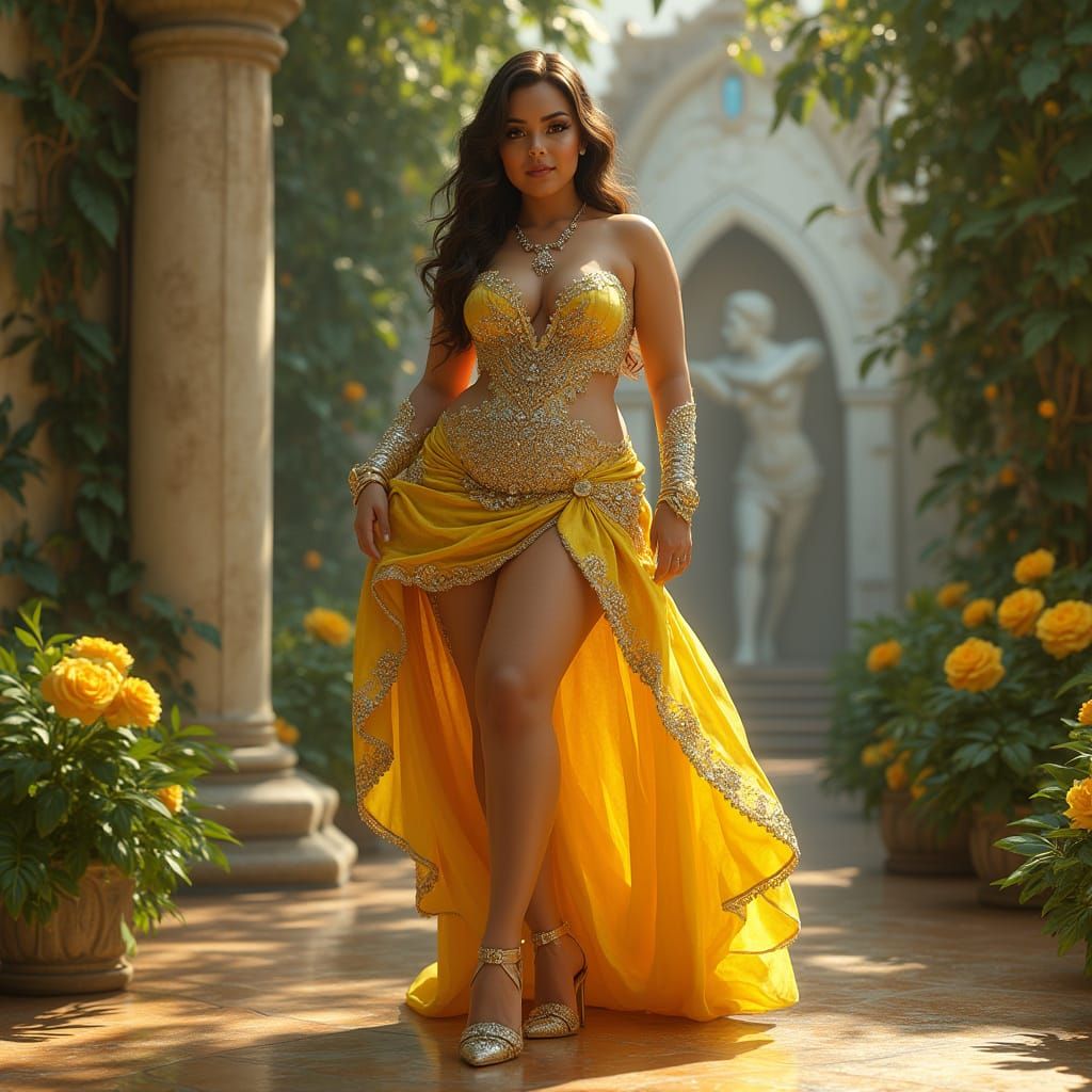 This image shows a curvy Victorian woman in ornate, metallic yellow and silver attire, accented with rhinestones. The 3D rendering features tropical plants, roses and a statue.