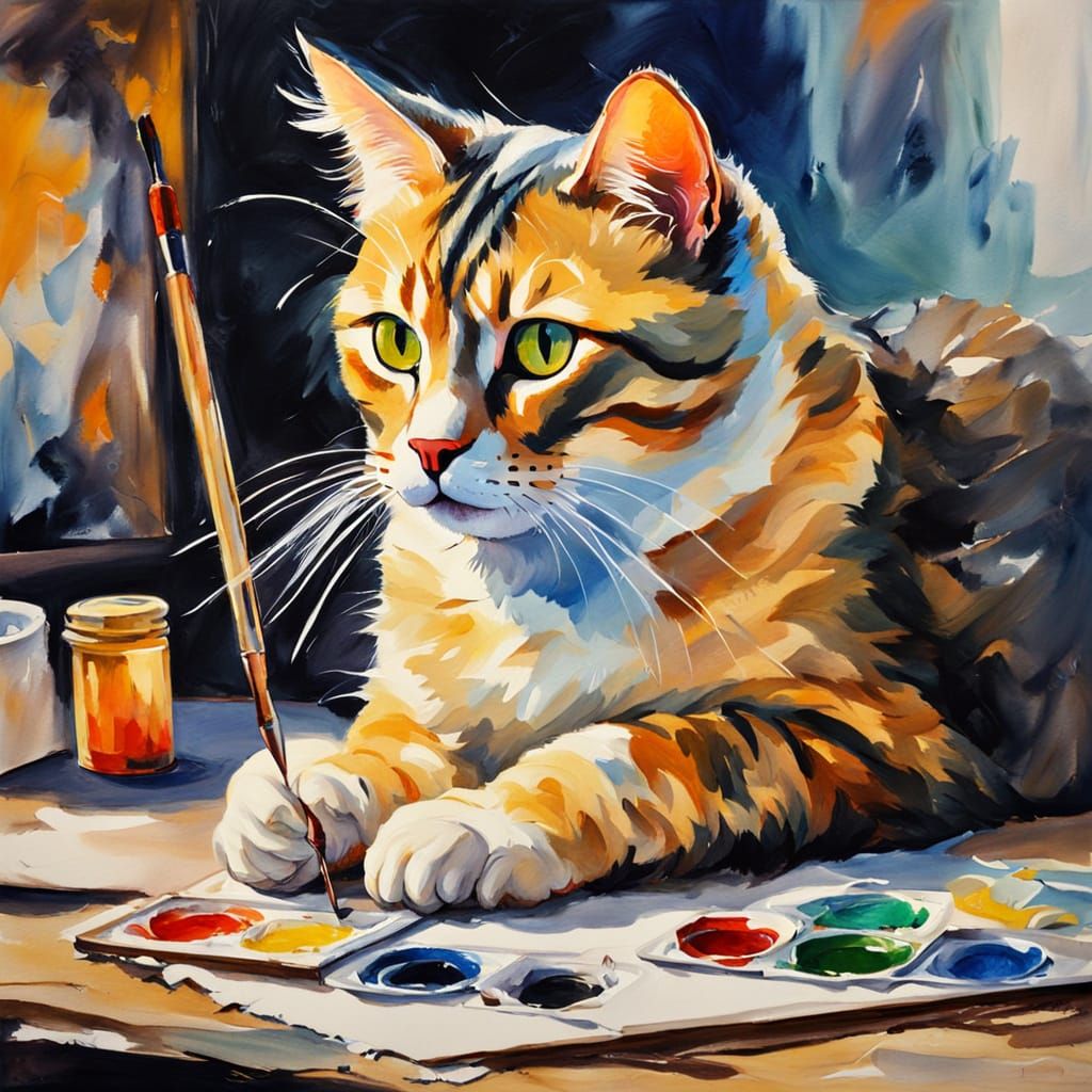 A vibrant oil painting depicting an artist in their studio painting a cat with watercolors. The Fauvist style features textured, thick brushstrokes, warm golden lighting, and expressive detail.