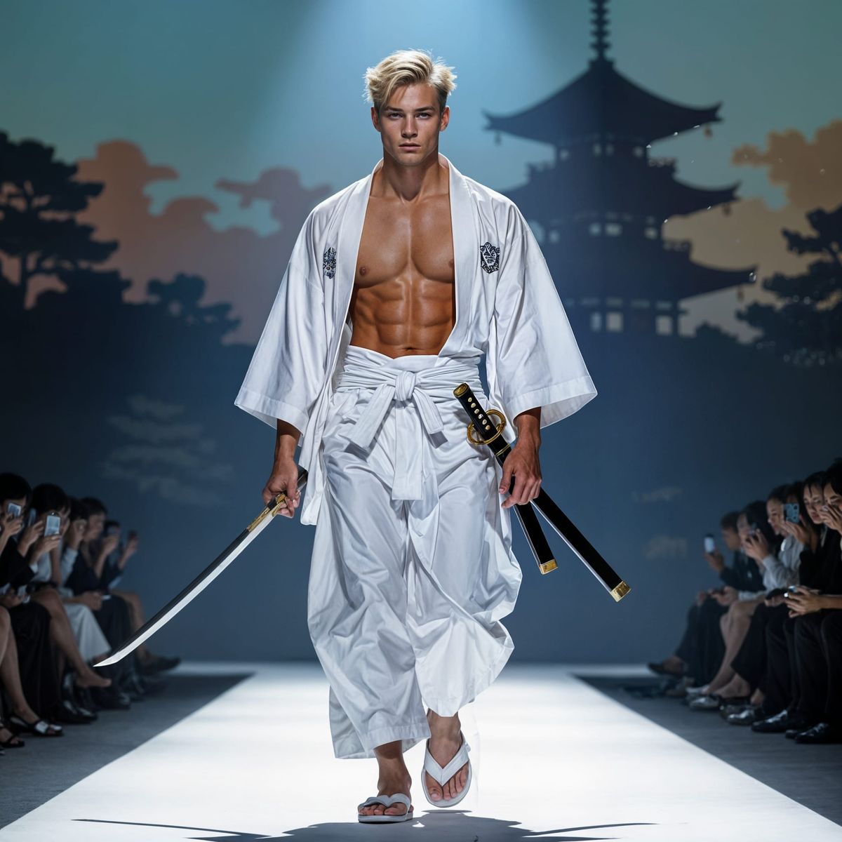 This image shows a handsome, athletic 19-year-old man walking confidently on a runway. He is shirtless, wearing a white kimono, briefs, and slippers, holding a samurai sword, depicted in a hyperrealistic splash art style.