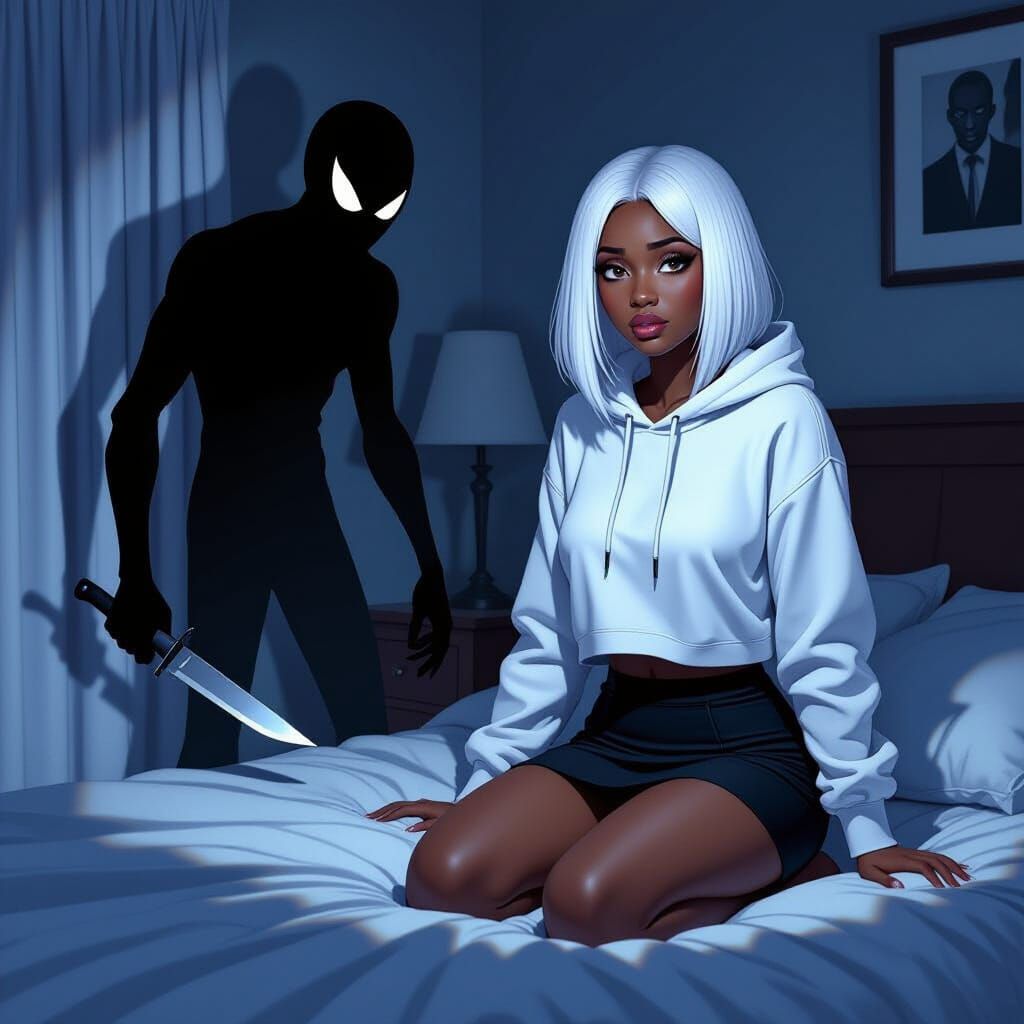 A hyperrealistic animated scene of a young African woman in her bedroom at midnight, facing a menacing shadow figure. Features dramatic lighting and a desaturated palette for suspense.