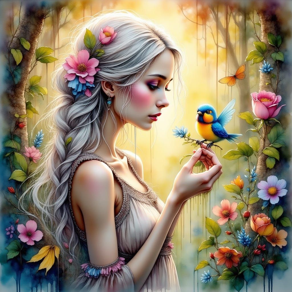 A digital painting of a woman with long white hair braided with flowers, feeding animals in a sunlit forest. The image is in an airbrush art style, with intricate details and vibrant colors.