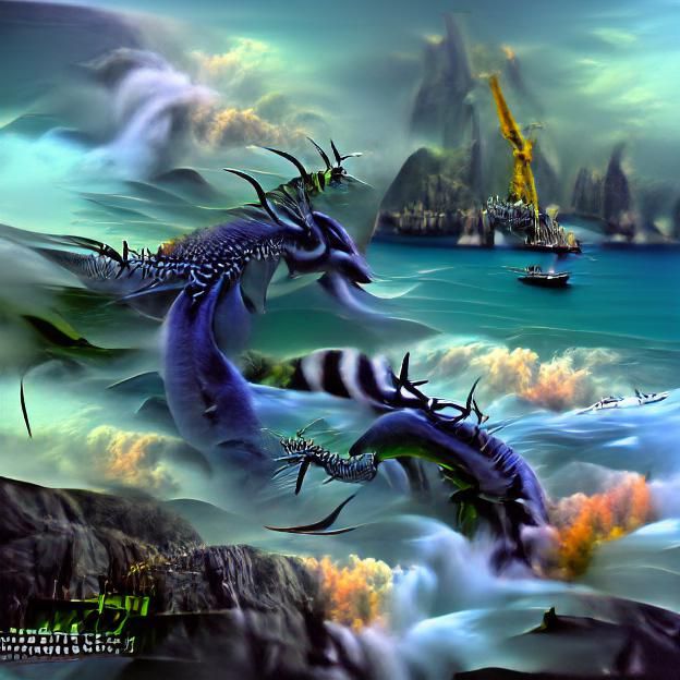 A majestic sea dragon in a fantastical landscape. This image captures the mythical creature with stunning detail, rendered as a digital matte painting.