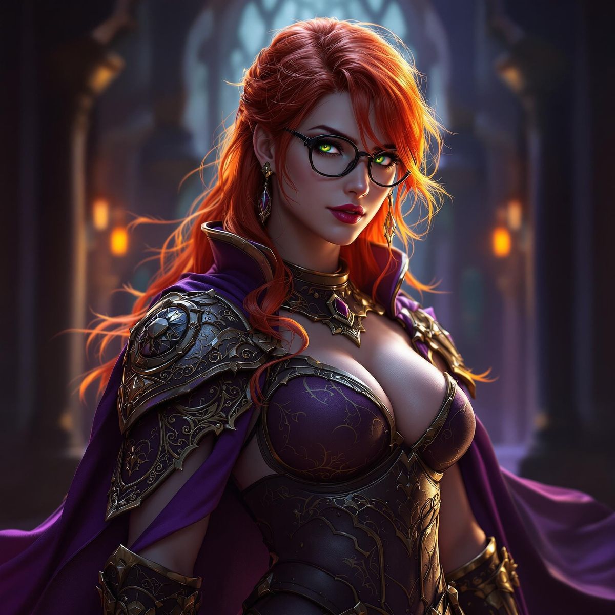 A striking picture of a muscular red-haired woman with green eyes and glasses, clad in leather armor and a cloak. Dynamic lighting enhances the dark, mystical background, rendered with hyperdetailed textures in vibrant hues.