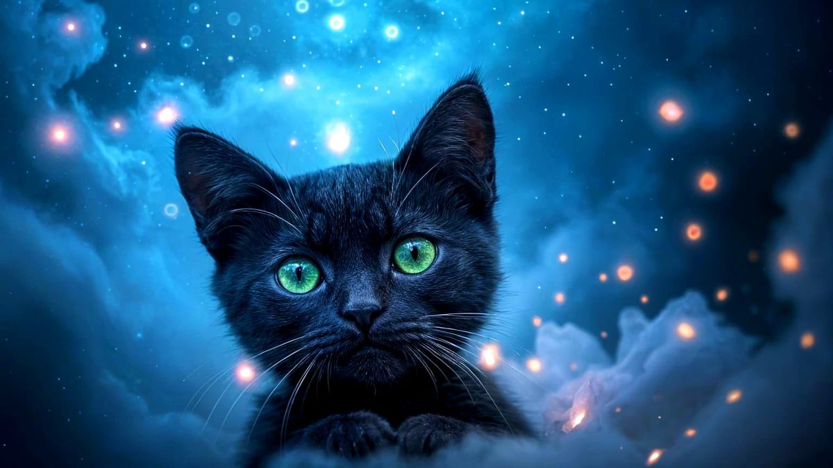 This image shows a close-up double exposure portrait of a black cat filled with bioluminescent stars, creating an ethereal, hyperdetailed fantasy scene reminiscent of Thomas Kinkade's style.
