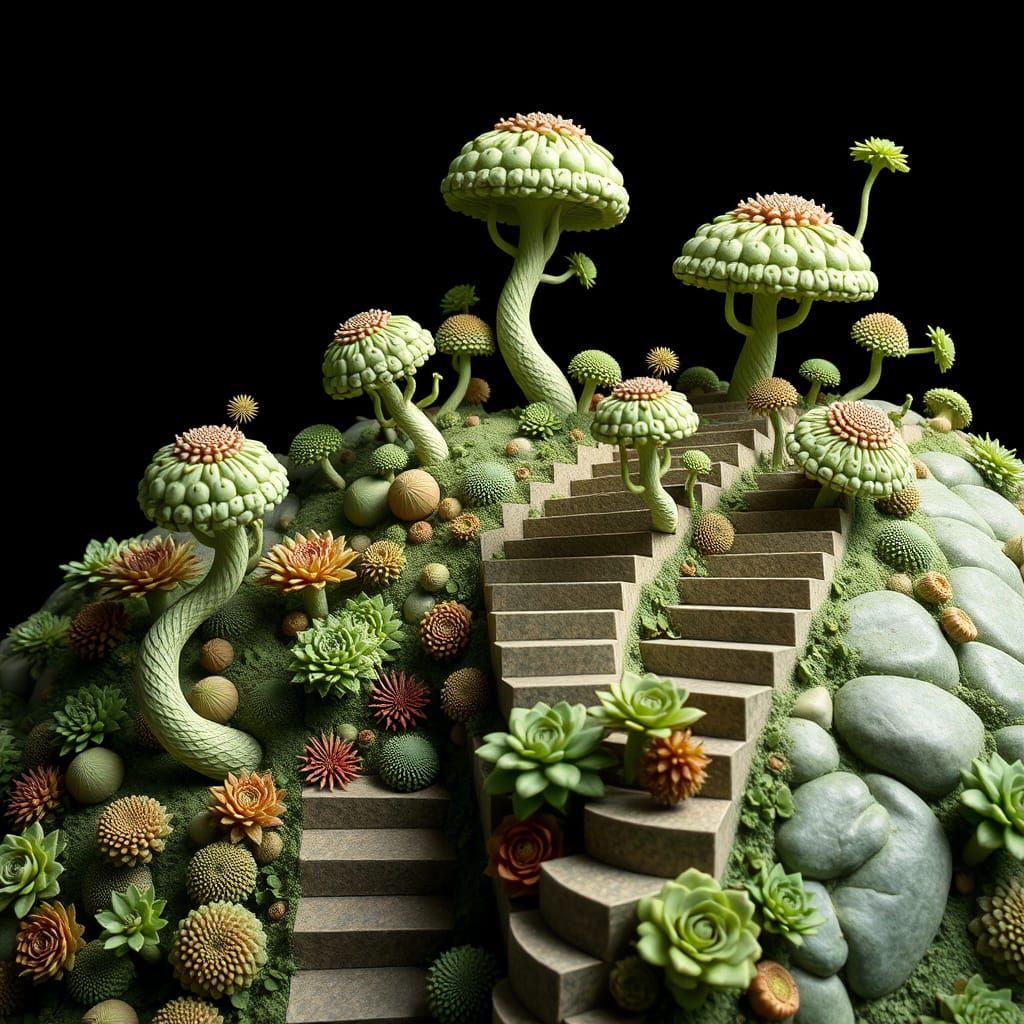 This image shows a surreal, Escher-inspired scene of lush, vibrant Polynesian atolls connected by winding staircases, teeming with psychedelic vegetation.