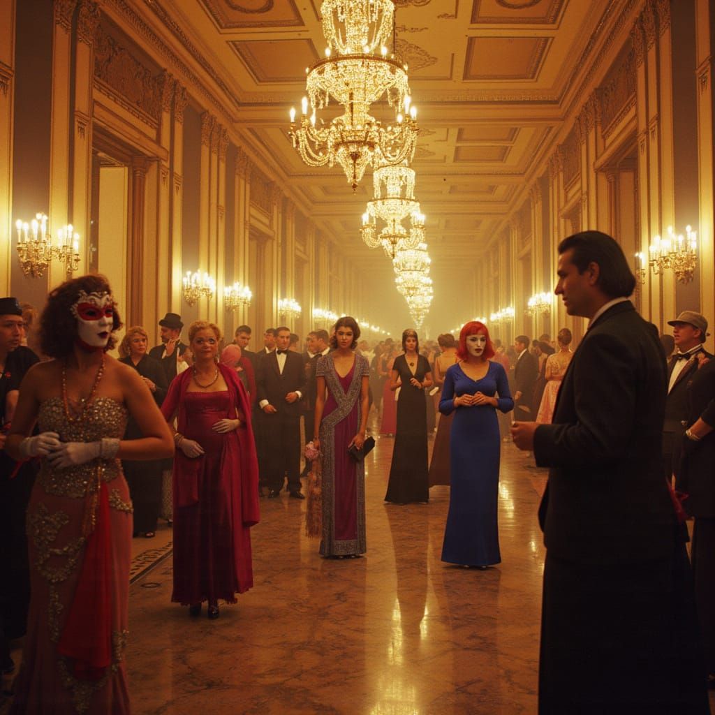 This image depicts a grand ballroom during a lively masquerade ball. Ornate chandeliers illuminate the scene, reflecting off marble floors and attendee's intricate masks in a dazzling, photorealistic spectacle.