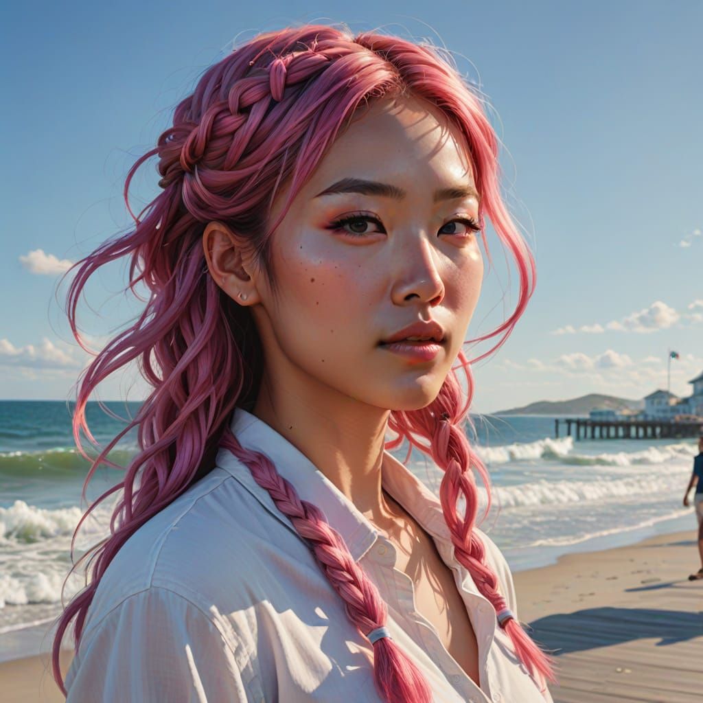 This image shows a vibrant young East Asian woman with pink hair highlights standing on a sunny seaside boardwalk. The picture captures a carefree, summery aesthetic in a splash art style.