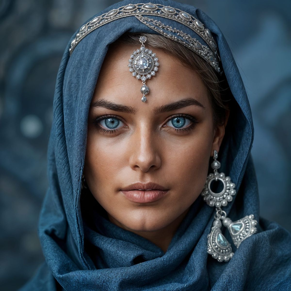This image features a woman with striking blue eyes and tan skin, gracefully adorned in a blue and silver hijab, complemented by silver jewelry. The portrait is set against a soft, blurred backdrop.