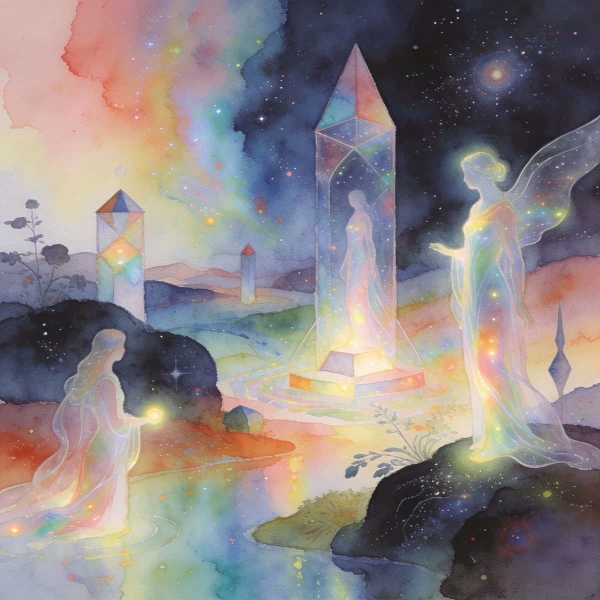 This image showcases an ethereal landscape where spirit beings and entities are made visible. Rendered in a cosmic watercolor style with vibrant, translucent colors, it evokes a dreamlike and mystical atmosphere.
