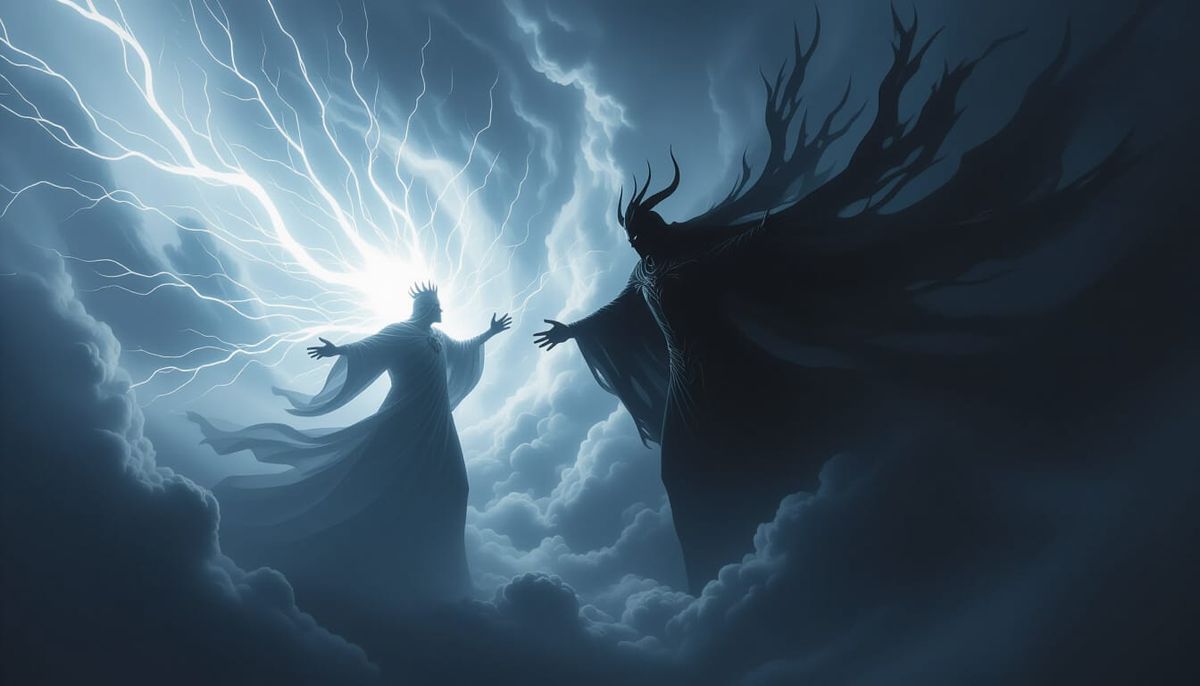 This image depicts a dramatic confrontation where a figure of darkness is consumed by a brilliant divine light. Rendered as an intricate digital matte painting, it features stark contrasts and dynamic, atmospheric lighting.