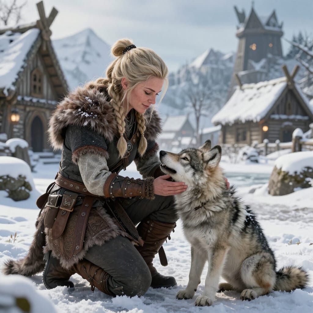 This image depicts a serene scene of a Viking woman with a wolf cub in a snow-covered village, rendered in a stylized realism CGI art style.
