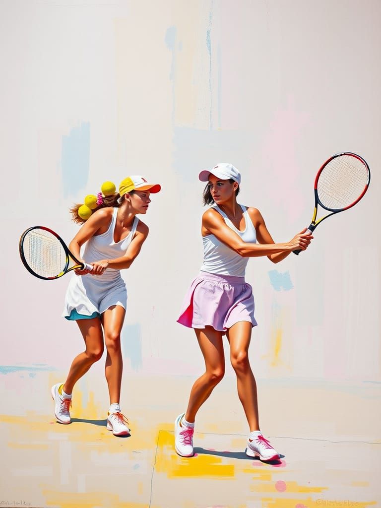 A modern abstract painting of tennis players in pastel colors with neon accents. The artwork features expressive brushstrokes and thick paint textures in an expressionist style.