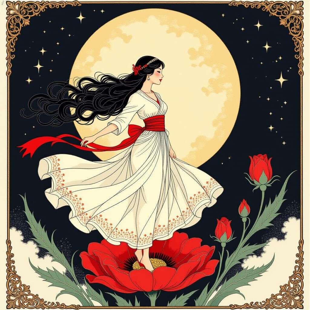 A black and white image shows a fairy with long hair in a flowing dress dancing on a red flower. A crescent moon shines above, in a dreamy aesthetic inspired by classic illustrators.