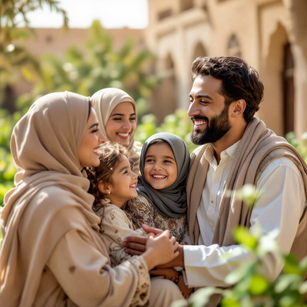 Generate your own images of happy family reunions in traditional Middle Eastern courtyards. Free and easy to use!