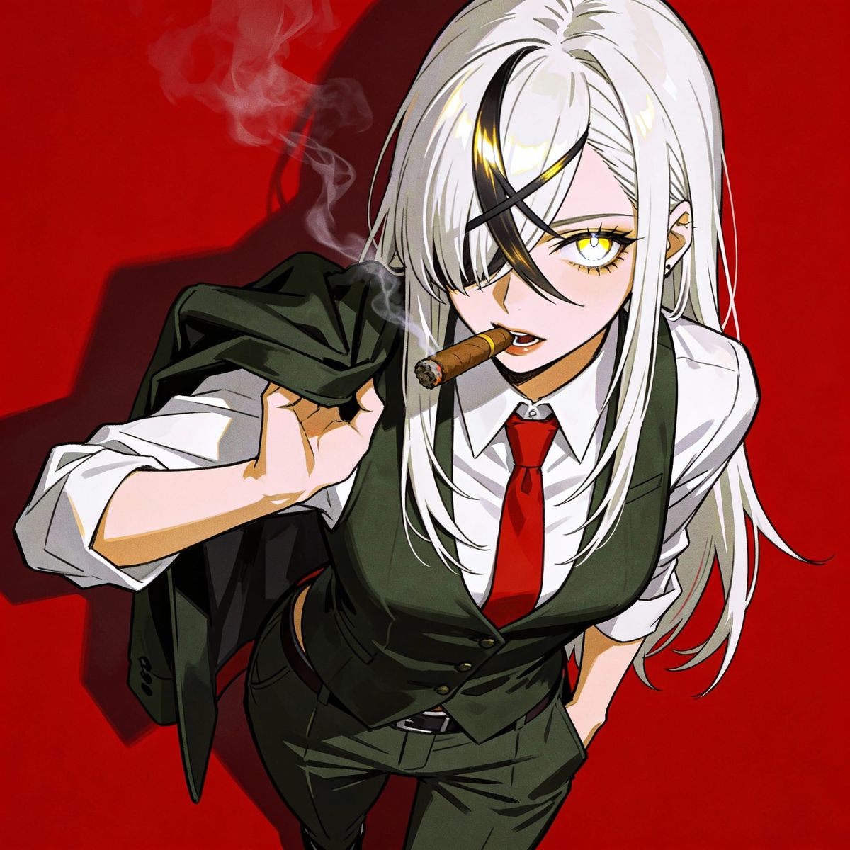 This image features Anya in a detailed Manhwa art style with striking yellow eyes, wearing a white shirt, green vest, and red tie. She is depicted dynamically smoking a cigar, rendered with bold outlines and deep shadows.