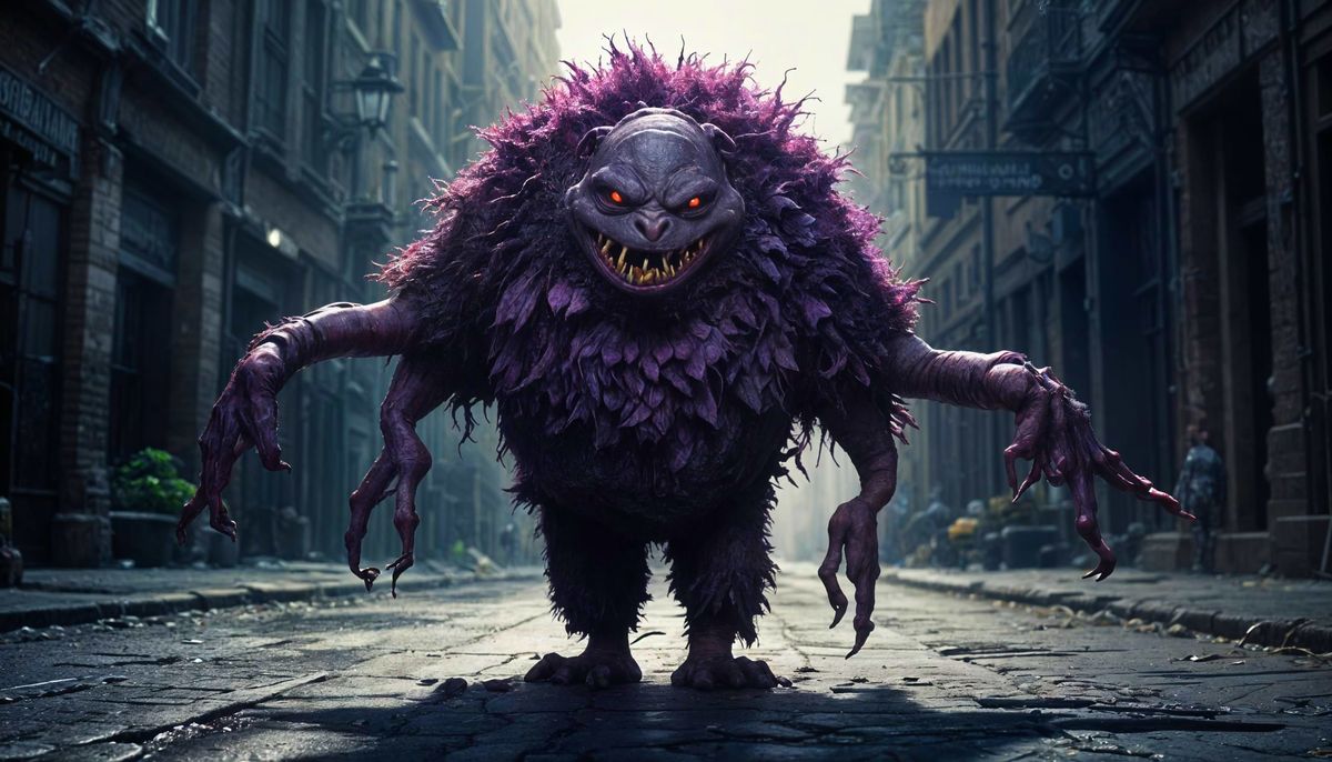 This image shows a photorealistic, high-contrast Grimace character in a gritty urban setting, with richly detailed textures and deep shadows. The creature's purple fur and four arms are illuminated by dynamic, low-key lighting.