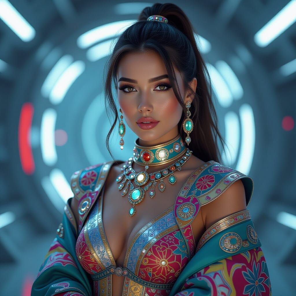 A hyperrealistic image of a woman in colorful futuristic clothing. The sleek, high-tech environment and vibrant colors create a striking, modern aesthetic reminiscent of digital art.