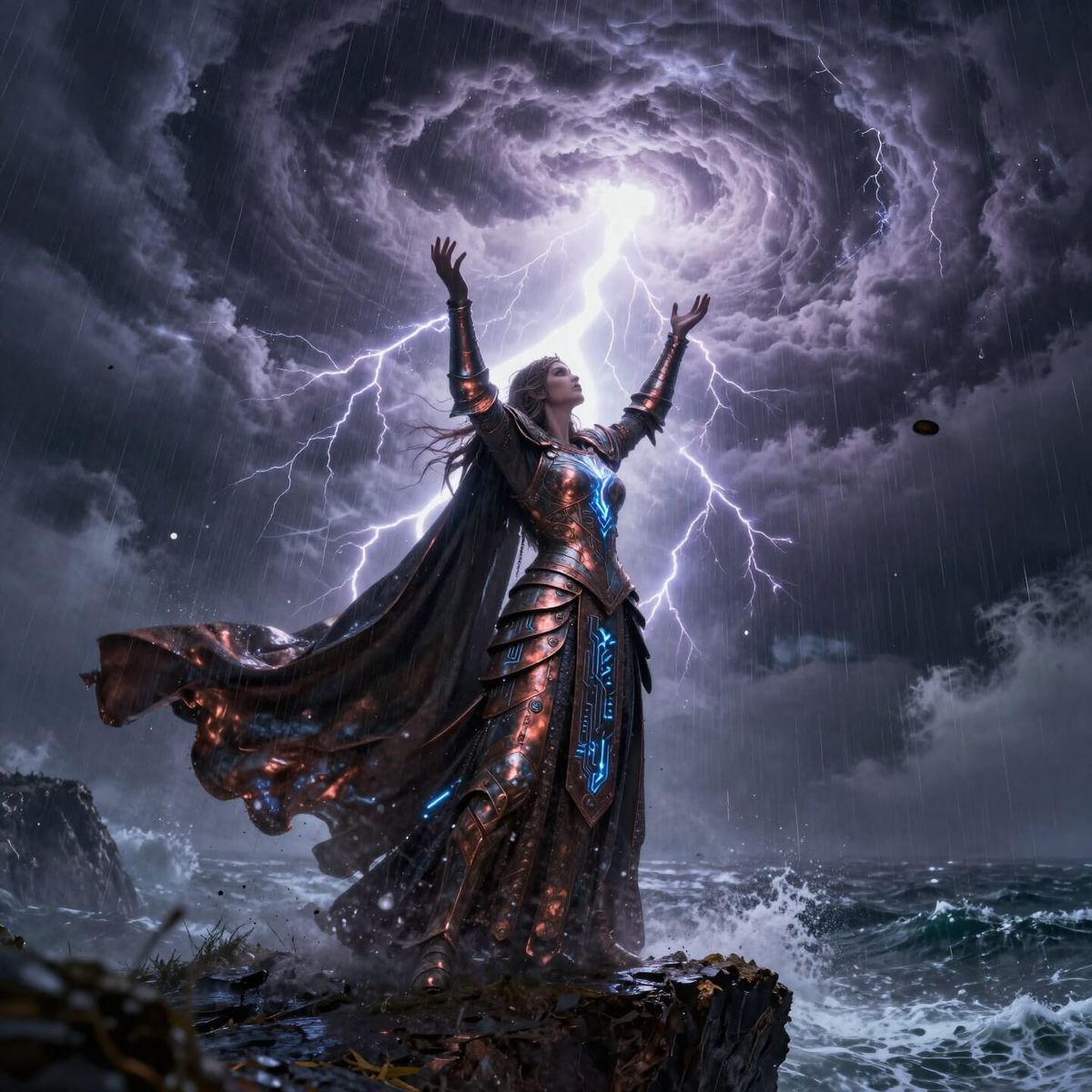 This image depicts a sorceress on a cliff, dramatically commanding a massive, lightning-filled storm. Photorealistic textures and volumetric lighting create an epic, cinematic atmosphere.