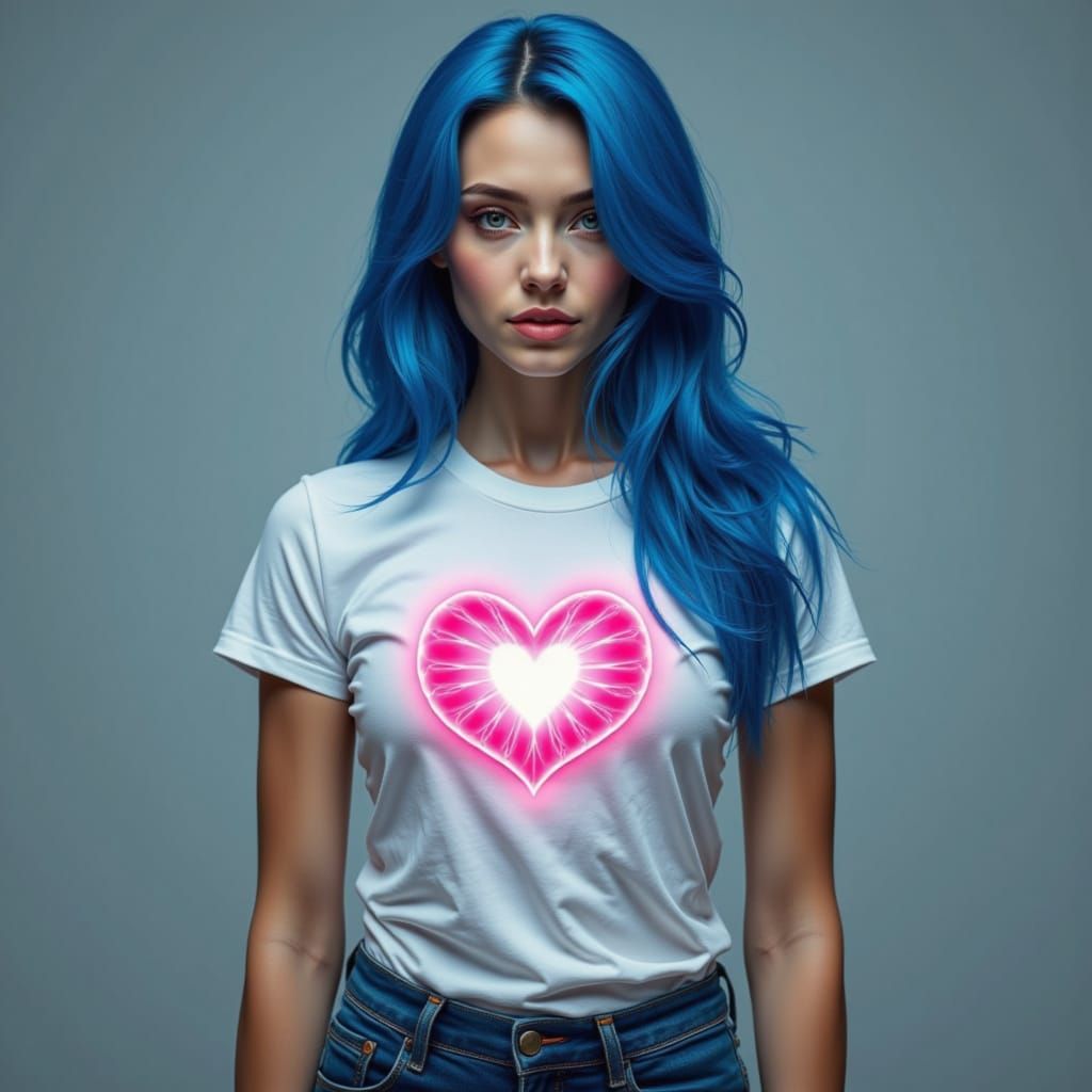 This image depicts a woman with long blue hair, her glowing heart visible beneath her white t-shirt. She is wearing blue jeans and rendered with a cyberpunk aesthetic.