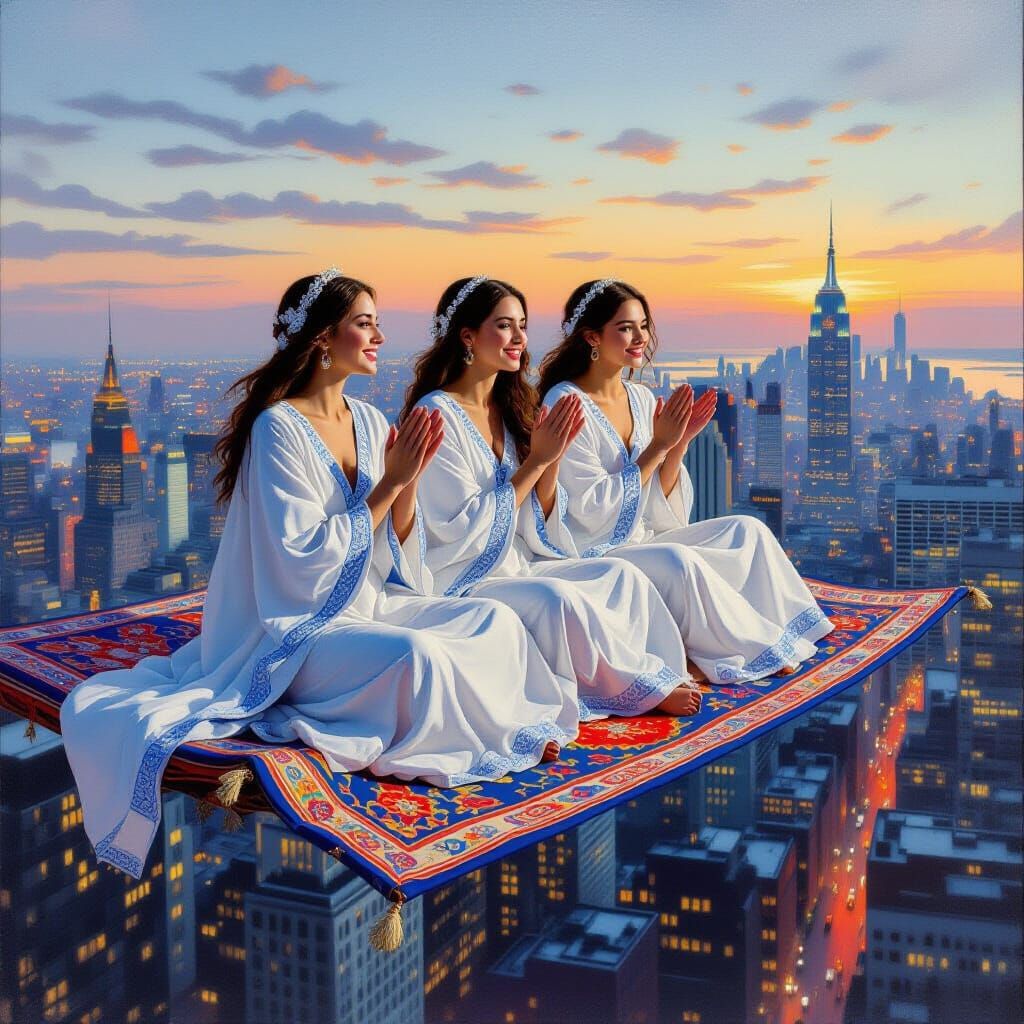 A hyperrealistic oil painting of two young women on a magic carpet. They are dressed in flowing robes, flying over a city at dusk, clapping. Rendered with a focus on photorealism.
