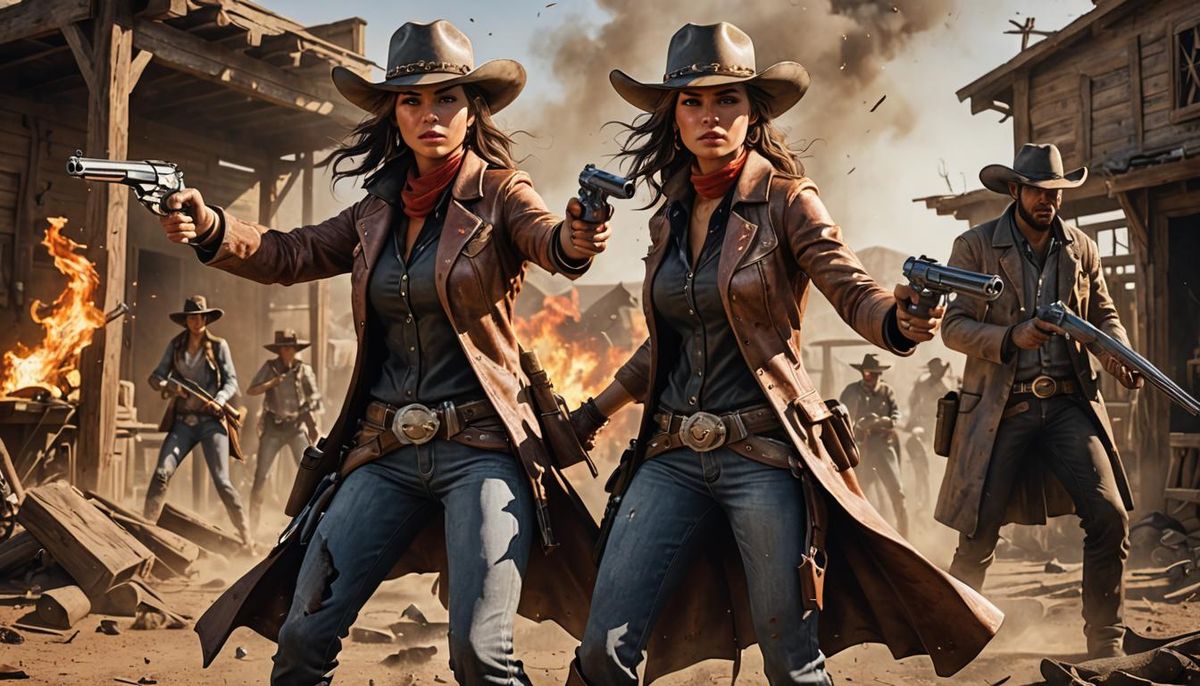 Cowgirls in the middle of a shoot out against the bad guys.