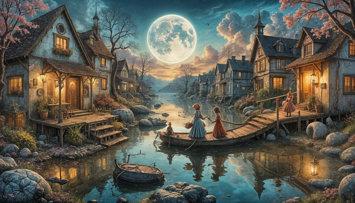 This vibrant oil painting combines figurative art with surreal and dreamlike elements, featuring intricate symbolic figures and fantastical architecture in a richly layered, painterly world.