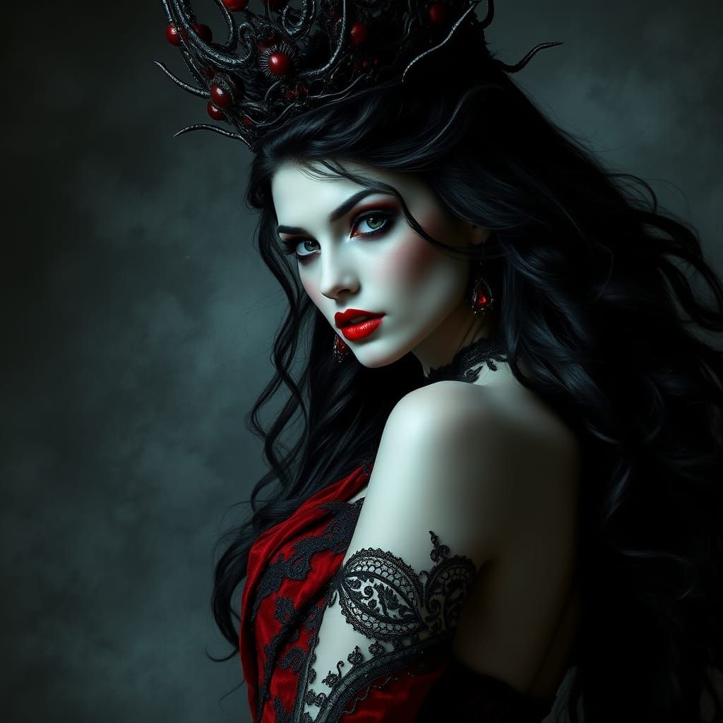 This enchanting image captures a regal vampire queen in a hauntingly beautiful, tattered black and crimson gown, adorned with intricate lace and velvet details, as she exudes dark, mystical allure and timeless beauty.