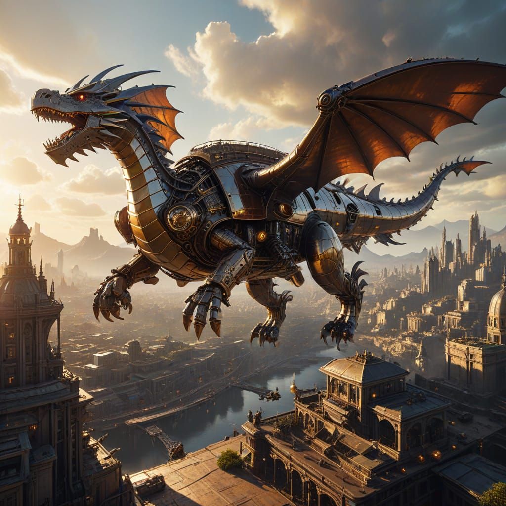 A chrome steampunk airship shaped like a mechanical dragon flies over an alien city in this wide-angle oil painting. The image features polished metal, intricate details, and golden hour lighting.