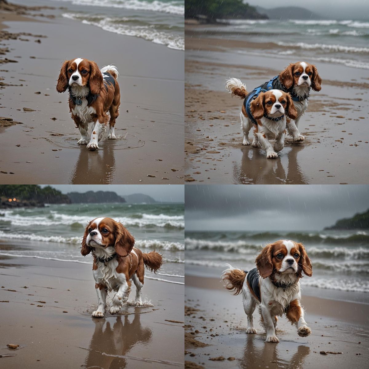 This image shows a Blenheim Cavalier King Charles spaniel enjoying a rainy day at the beach. The artwork is inspired by anime and rendered as detailed 3D concept art.