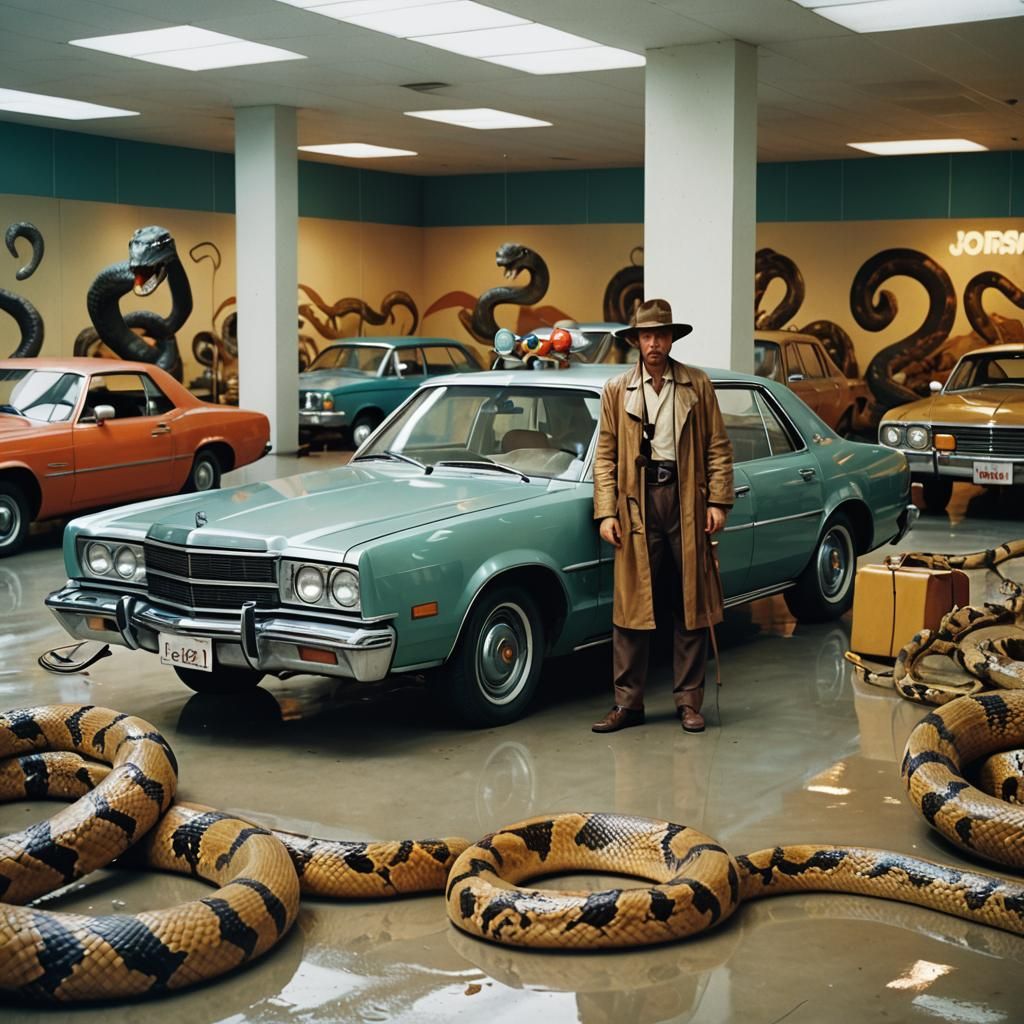 A surreal scene depicting Indiana Jones as a car salesman in a snake pit. This photorealistic image blends elements of naive art, romanticism, and post-impressionism in a colorful, wide-angle view.