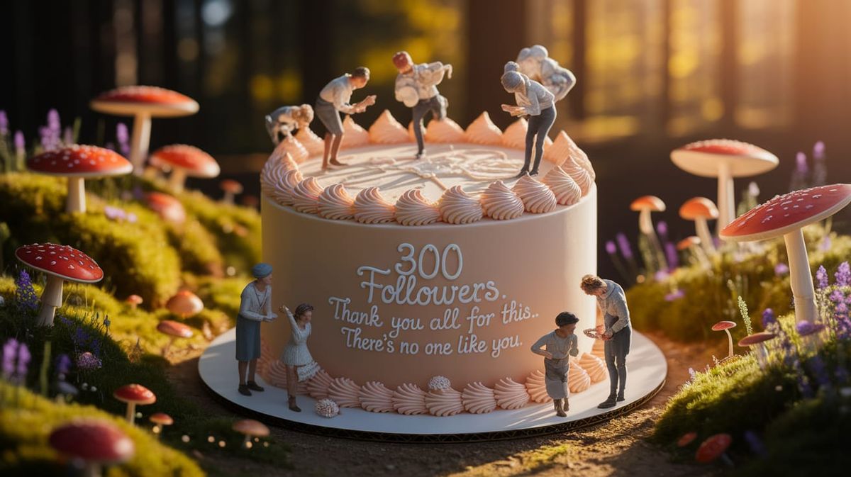 Tiny miniature people work around a cake that says "300 followers. Thank you all for this. There's no one like you."